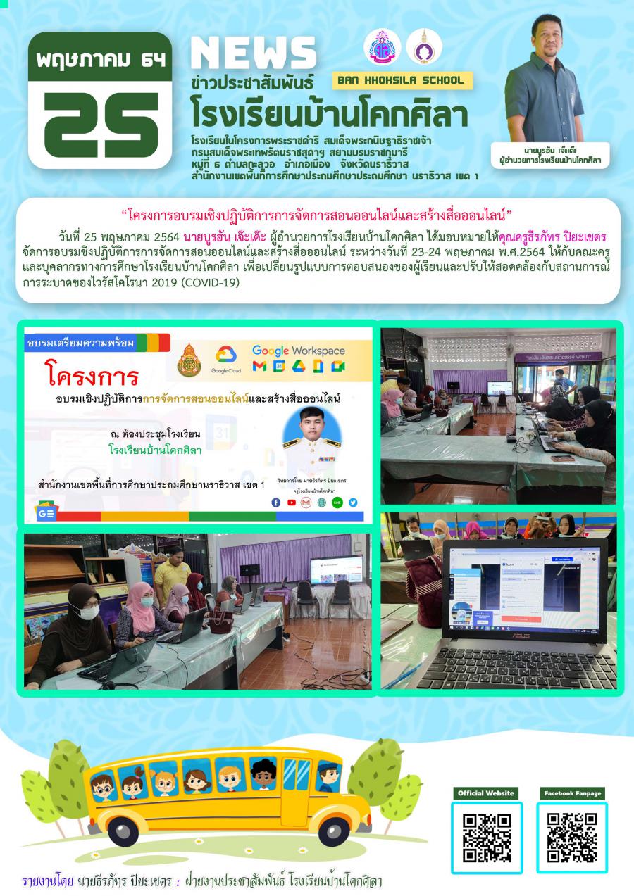 โครงการอบรมชิงปฏิบัติการการจัดการสอนออนไลน์และสร้างสื่อออนไลน์ ระหว่างวันที่ 23-24 พฤษภาคม พ.ศ.2564 ให้กับคณะครูและบุคลากรทางการศึกษาโรงเรียนบ้านโคกศิลา