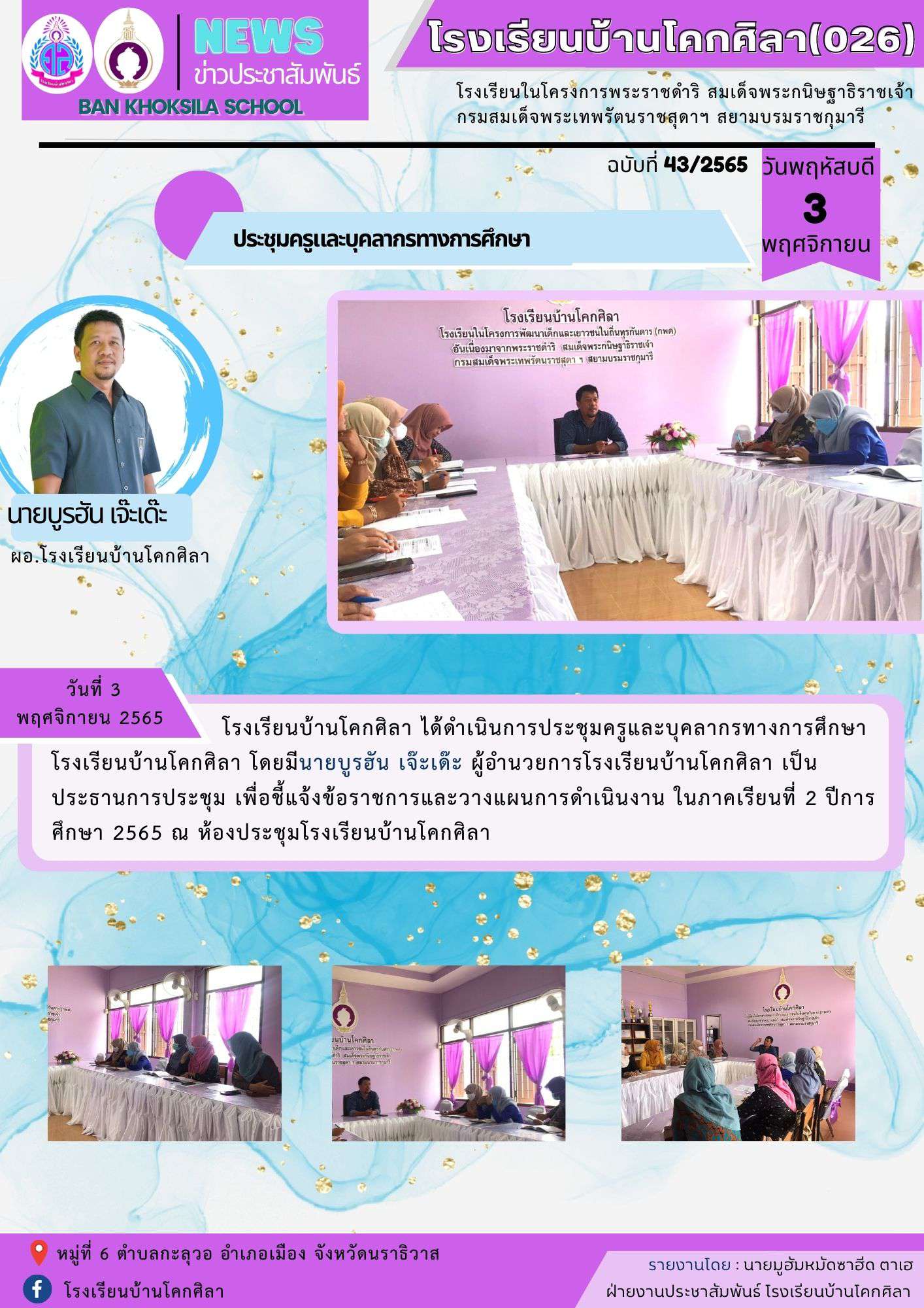 วันที่ 3 พฤศจิกายน 2565 โรงเรียนบ้านโคกศิลา ได้ดำเนินการประชุมครูและบุคลากรทางการศึกษาโรงเรียนบ้านโคกศิลา โดยมีนายบูรฮัน เจ๊ะเด๊ะ ผู้อำนวยการโรงเรียนบ้านโคกศิลา เป็นประธานการประชุม เพื่อชี้แจ้งข้อราชการและวางแผนการดำเนินงาน ในภาคเรียนที่ 2 ปีการศึกษา 2565 ณ ห้องประชุมโรงเรียนบ้านโคกศิลา