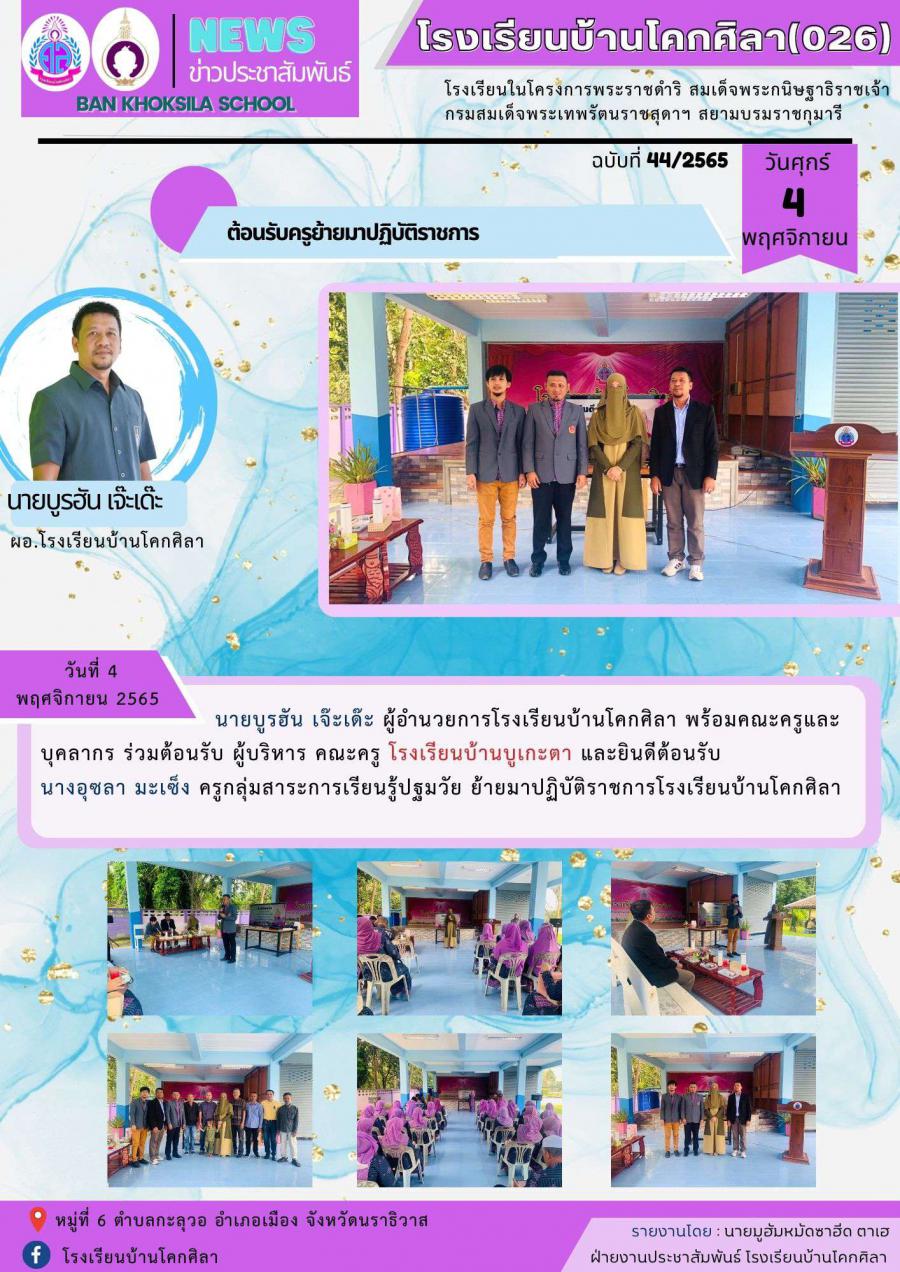 วันที่ 4 พฤศจิกายน 2565 นายบูรฮัน เจ๊ะเด๊ะ ผู้อำนวยการโรงเรียนบ้านโคกศิลา พร้อมคณะครูและบุคลากร ร่วมต้อนรับ ผู้บริหาร คณะครู โรงเรียนบ้านบูเกะตา และยินดีต้อนรับ นางอุซลา มะเซ็ง ครูกลุ่มสาระการเรียนรู้ปฐมวัย ย้ายมาปฏิบัติราชการโรงเรียนบ้านโคกศิลา