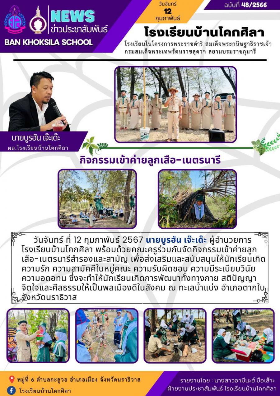 วันจันทร์ ที่ 12 กุมภาพันธ์ 2567 นายบูรฮัน เจ๊ะเด๊ะ ผู้อำนวยการโรงเรียนบ้านโคกศิลา พร้อมด้วยคณะครูร่วมกันจัดกิจกรรมเข้าค่ายลูกเสือ-เนตรนารีสำรองและสามัญ เพื่อส่งเสริมและสนับสนุนให้นักเรียนเกิดความรัก ความสามัคคีในหมู่คณะ ความรับผิดชอบ ความมีระเบียบวินัย ความอดอทน ซึ่งจะทำให้นักเรียนเกิดการพัฒนาทั้งทางกาย สติปัญญา จิตใจและศีลธรรมให้เป็นพลเมืองดีในสังคม ณ ทะเลน้ำแบ่ง อำเภอตากใบ จังหวัดนราธิวาส