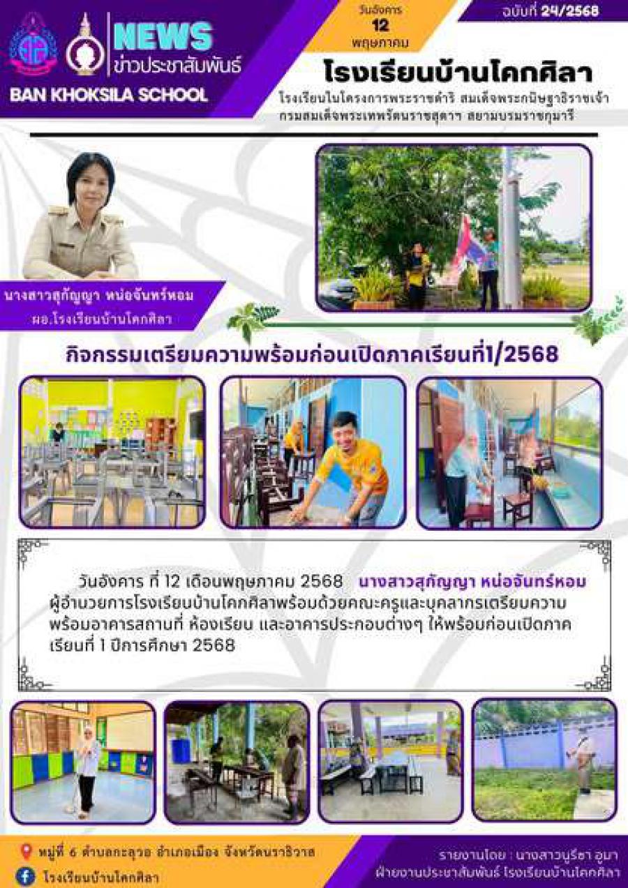 นางสาวสุกัญญา หน่อจันทร์หอม ผู้อำนวยการโรงเรียนบ้านโคกศิลา พร้อมด้วยคณะครูและบุคลากรทางการศึกษา เตรียมความพร้อมอาคารสถานที่ ห้องเรียน และอาคารประกอบต่างๆ พร้อมเปิดเรียนภาคเรียนที่ 1 ปีการศึกษา 2568